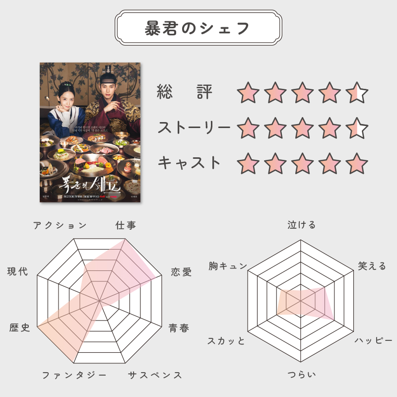 『ホンが全然暴君ではない』『最後は人が一気に亡くなり過ぎ』『料理バトルのシーンが長過ぎる』など、突っ込み所はありましたが、全体的に面白かったです。